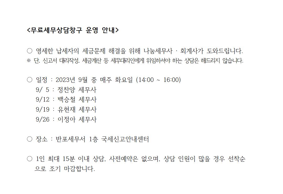 ※ 단, 신고서 대리작성, 세금계산 등 세무대리인에게 위임하셔야 하는 상담은 해드리지 않습니다.