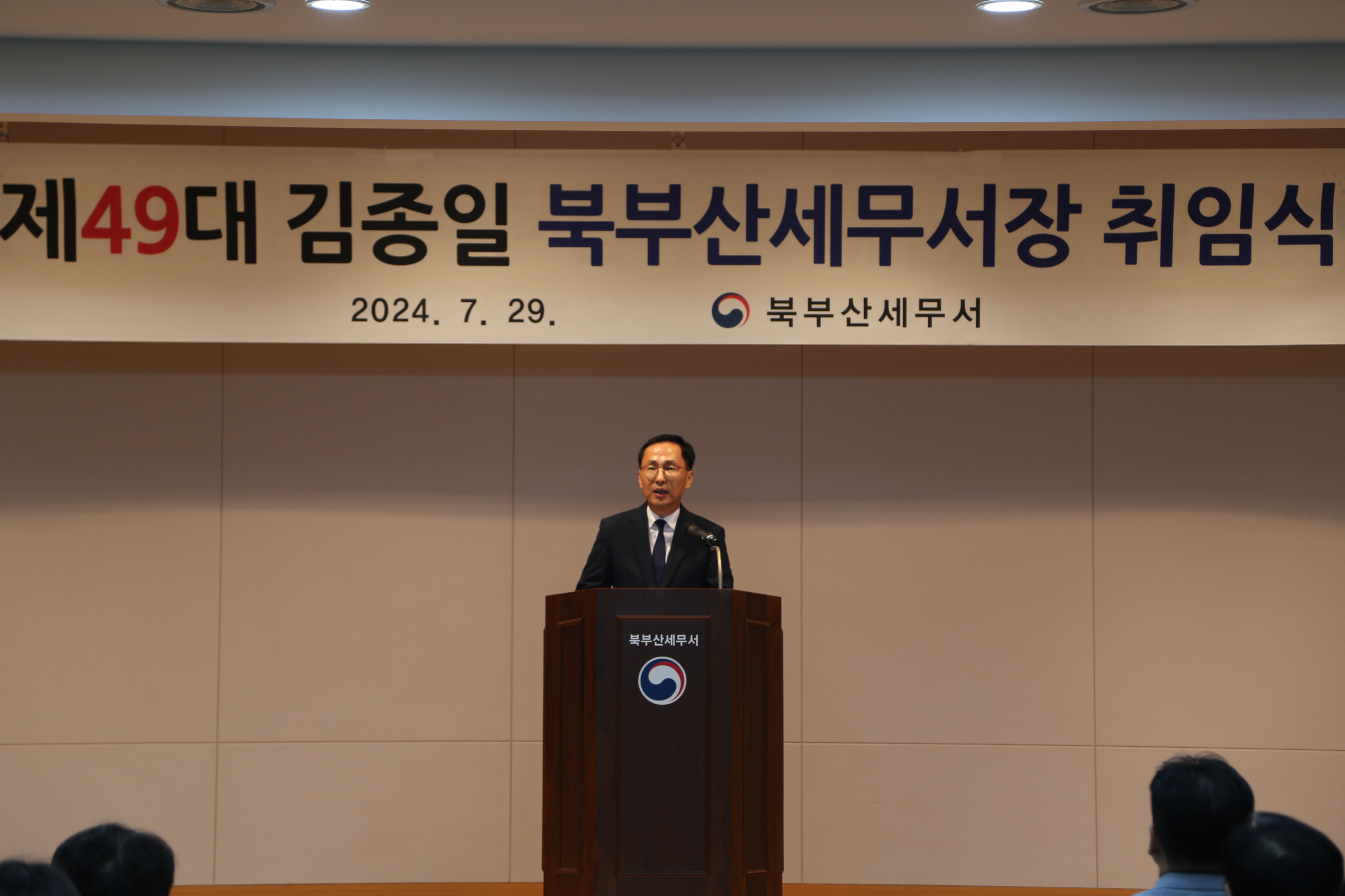 2024.07.29. 북부산세무서는 제49대 김종일 북부산세무서장의 취임식을 가졌습니다.김종일 서장은 취임사에서 「납세자를 따뜻하게 감싸는 세정 실천」이 되도록 노력하고 「성실한 납세자가 이익을 보는 공정한 세정 실천」을 펼치자고 다짐하였습니다.