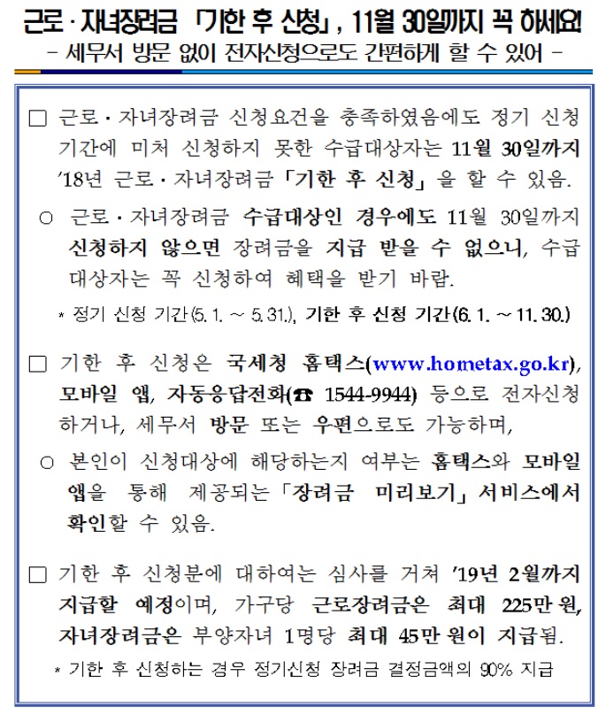 근로·자녀장려금「기한 후 신청」, 11월 30일까지 꼭 하세요!