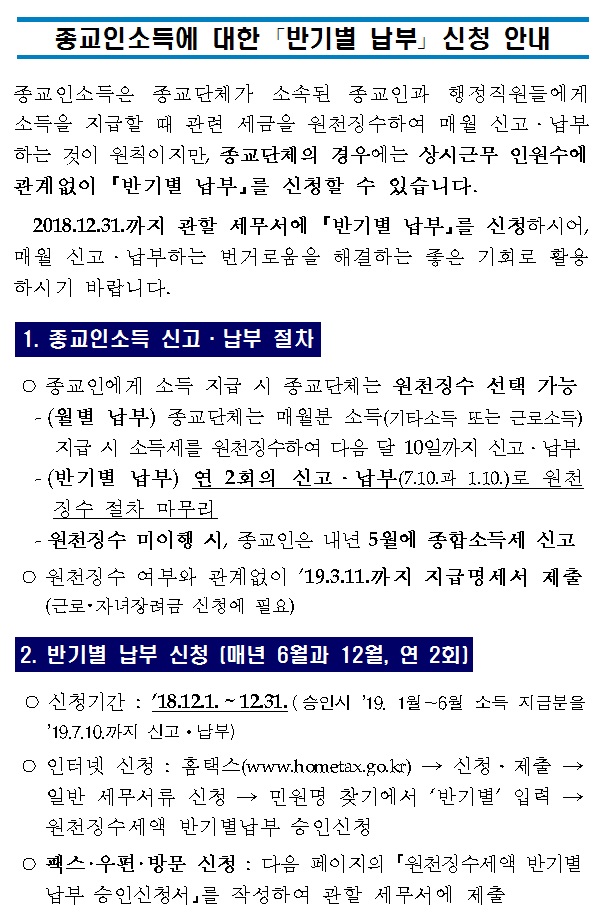 종교인소득에 대한「반기별 납부」신청 안내