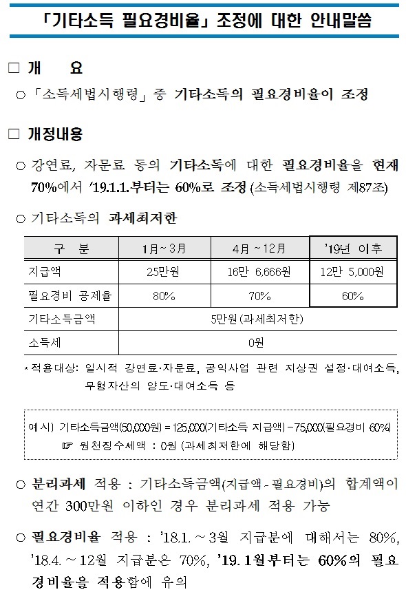 「기타소득 필요경비율」조정에 대한 안내말씀