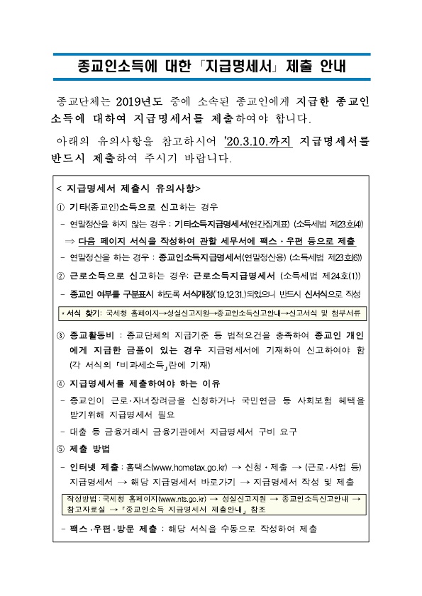 종교인 소득에 대한 지급명세서 제출 안내