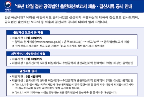 동영상으로 알아보는 출연재산 보고서 작성 요령 https://www.nts.go.kr/popup/pop_movie_player.asp?seq=200&lang=ko 동영상으로 알아보는 결산서류 등 공시서식 작성요령 https://www.nts.go.kr/popup/pop_movie_player.asp?seq=202&lang=ko