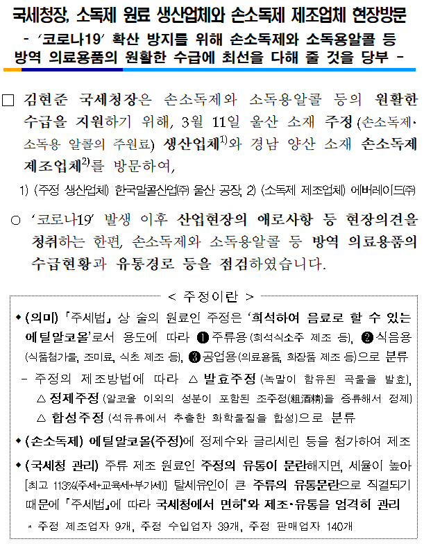 국세청장, 소독제 원료 생산업체와 손소독제 제조업체 현장 방문