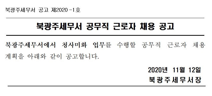 북광주세무서 공무직(환경미화) 근로자 채용 공고