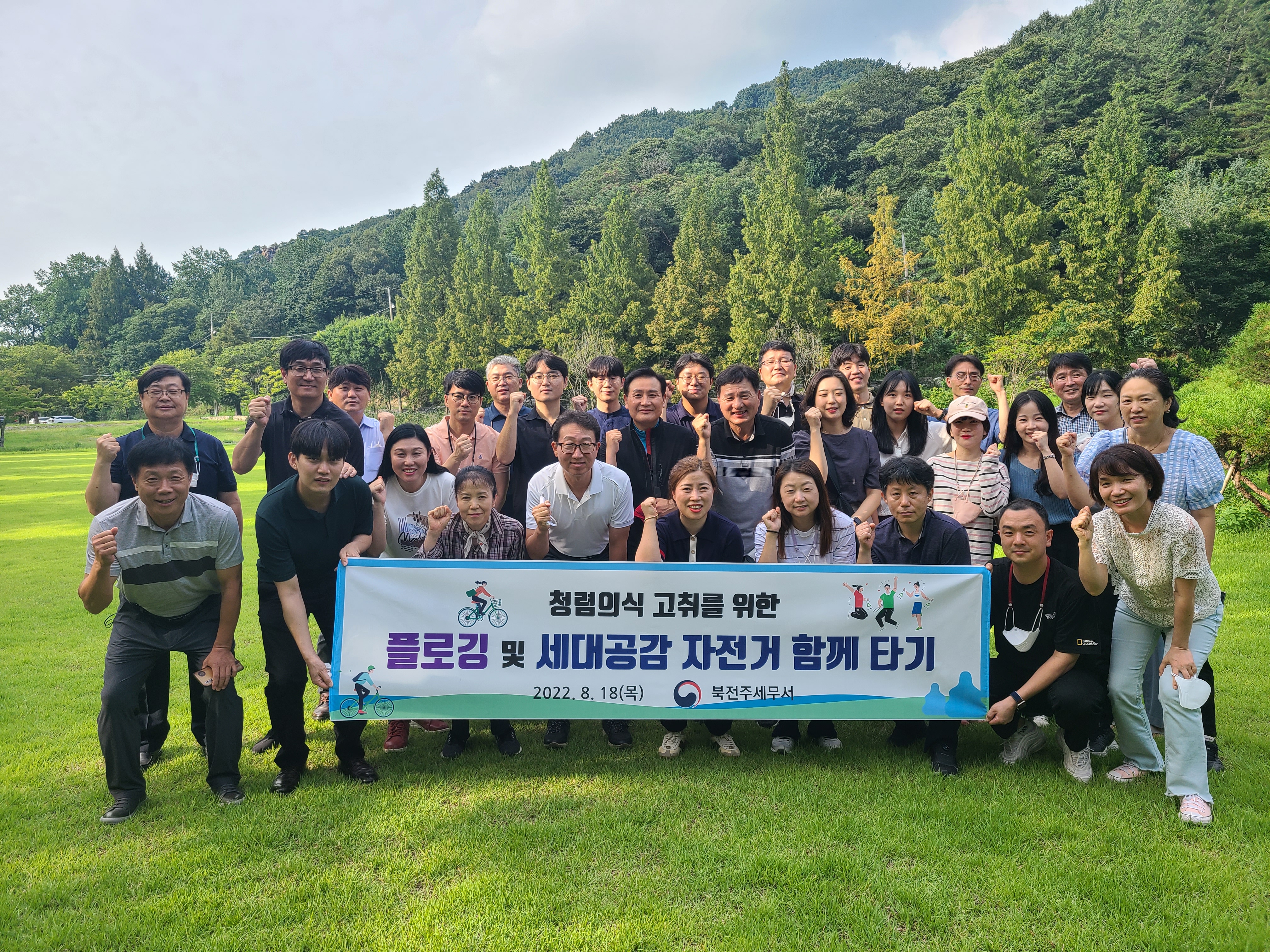 북전주세무서(서장 안형태) 직원30여명은 8월18일(목)16:30~18:00 전주 생태박물관 주변에서 자전거를 함께 타며 봉사활동을 실천함으로써 건강과 환경을 동시에 챙기고 직원간 친선도모 및 지역사회에 공헌하고자 『플로깅 및 세대공감 자전거 함께 타기 』행사를 가졌습니다. 전주시 치명자산 평화의 전당, 전주생태박물관 주변 주요 쓰레기 무단투기 장소를 돌면서 쓰레기를 줍는 봉사활동을 전개해 큰 호응을 얻었습니다.