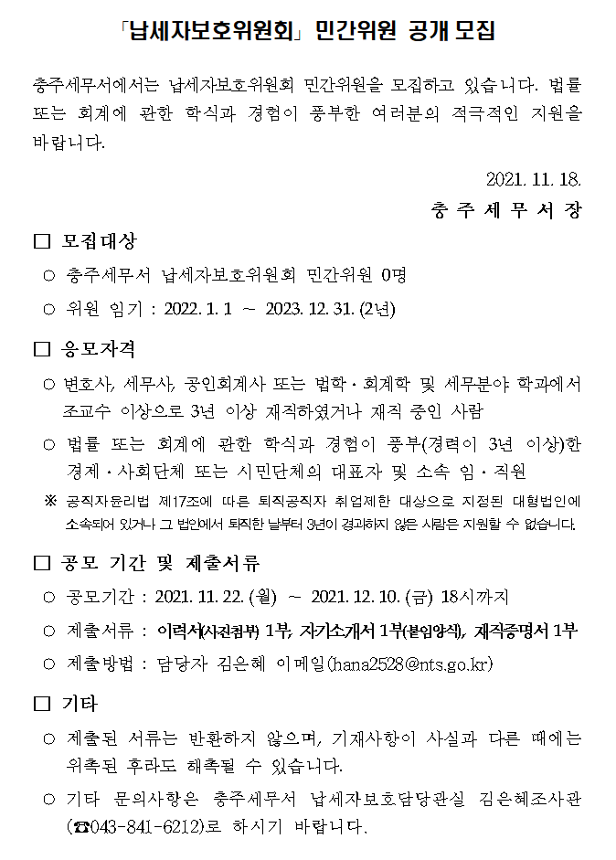 납세자보호위원회 민간위원 공개모집 충주세무서에서는 납세자보호위원회 민간위원을 모집하고 있습니다. 법률 또는 회계에 관한 학식과 경험이 풍부한 여러분의 적극적인 지원을 바랍니다. 2021.11.18. 충주세무서장