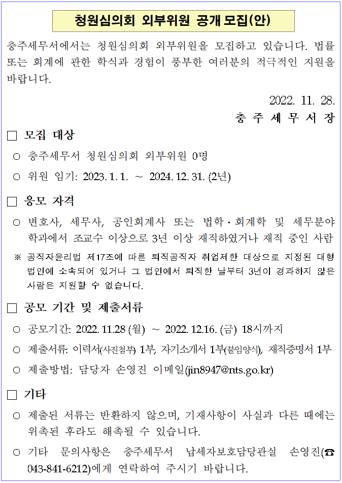 충주세무서에서는 청원심의회 외부위원을 모집하고 있습니다. 법률 또는 회계에 관한 학식과 경험이 풍부한 여러분의 적극적인 지원을 바랍니다.