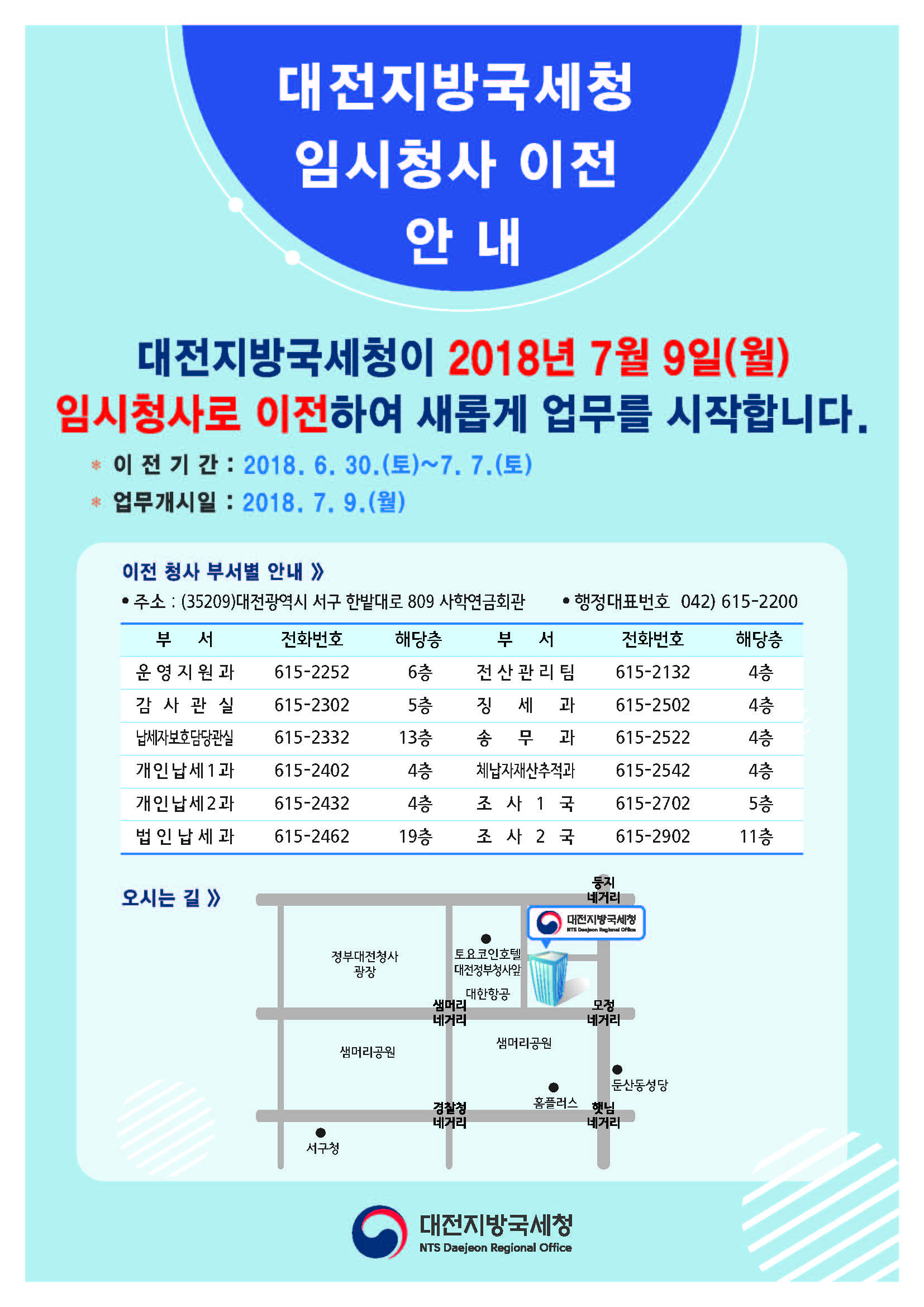 대전지방국세청이 7월 9일부터 임시청사에서 업무를 시작합니다.