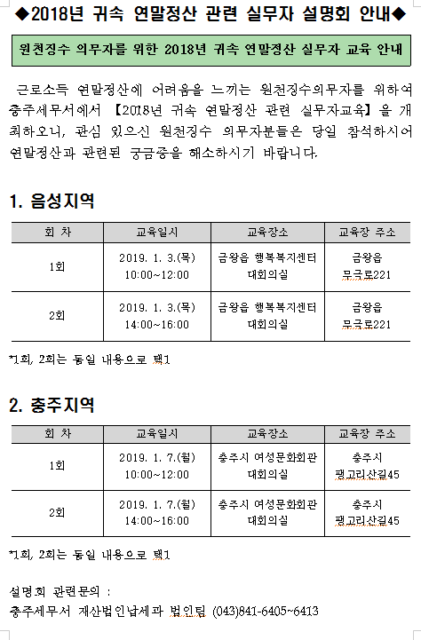 2018년 귀속 연말정산 관련 실무자 설명회 안내