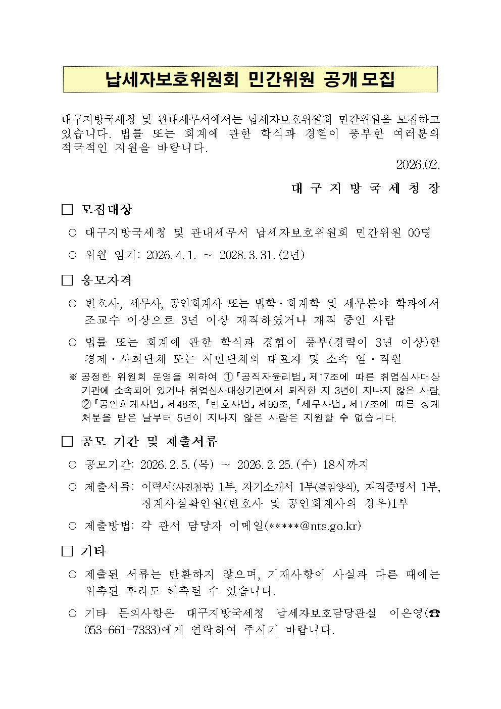 2026년 납세자보호위원회 민간위원 공개모집
