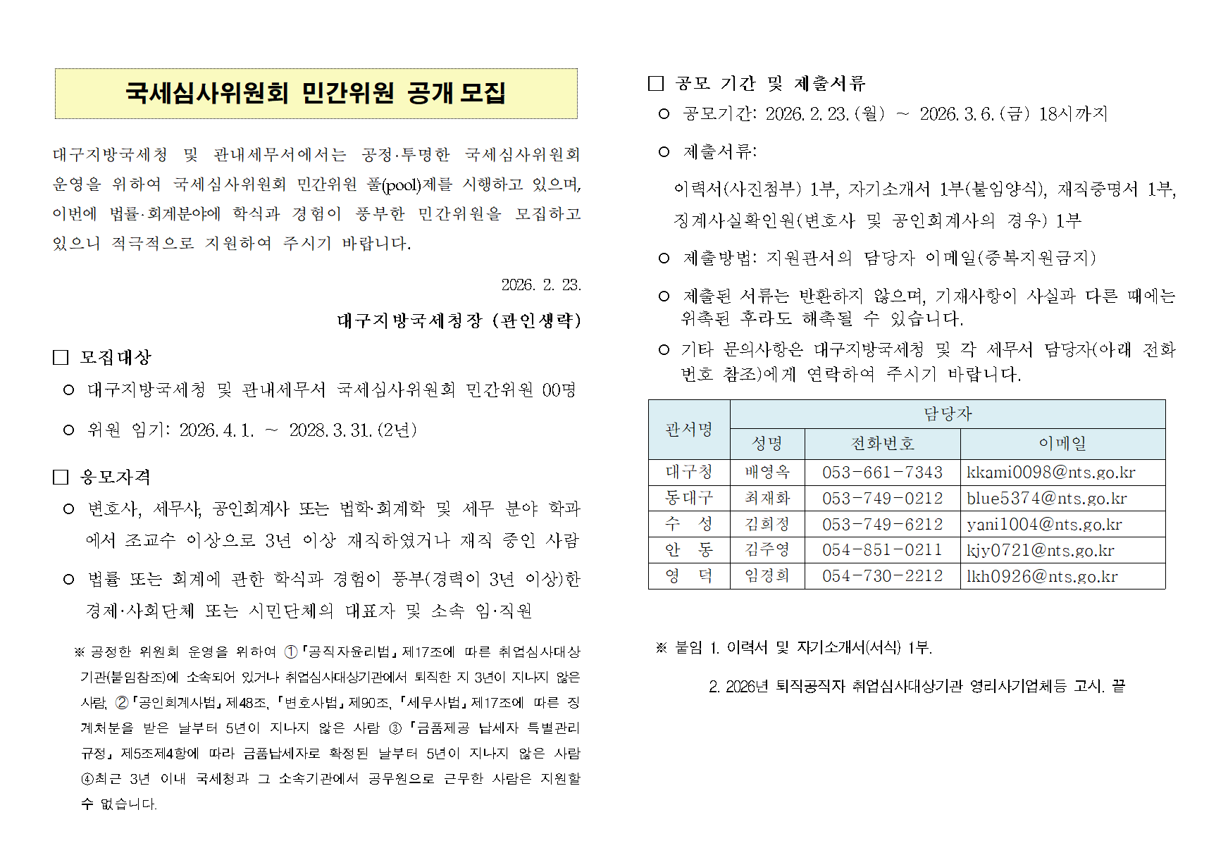 대구지방국세청 국세심사위원회 민간위원 공개모집