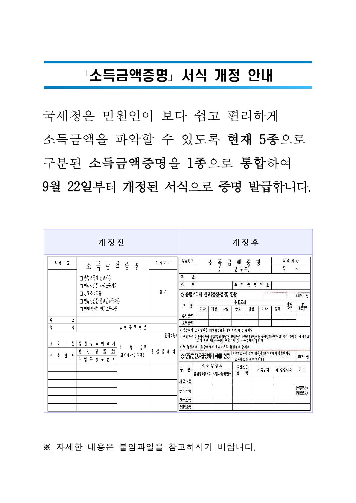 「소득금액증명」 서식 개정 안내