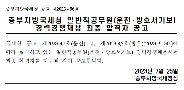 중부지방국세청 일반직공무원(운전·방호 9급) 채용 최종합격자 공고(제2023-56호).hwp