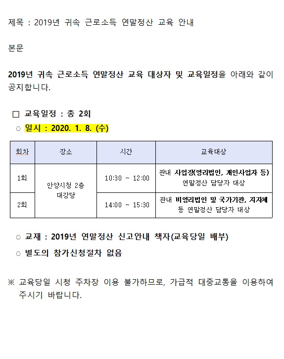 2019년 귀속 근로소득 연말정산 교육 안내