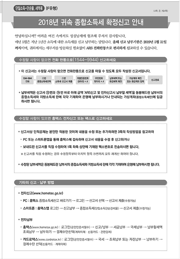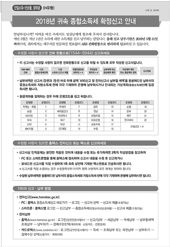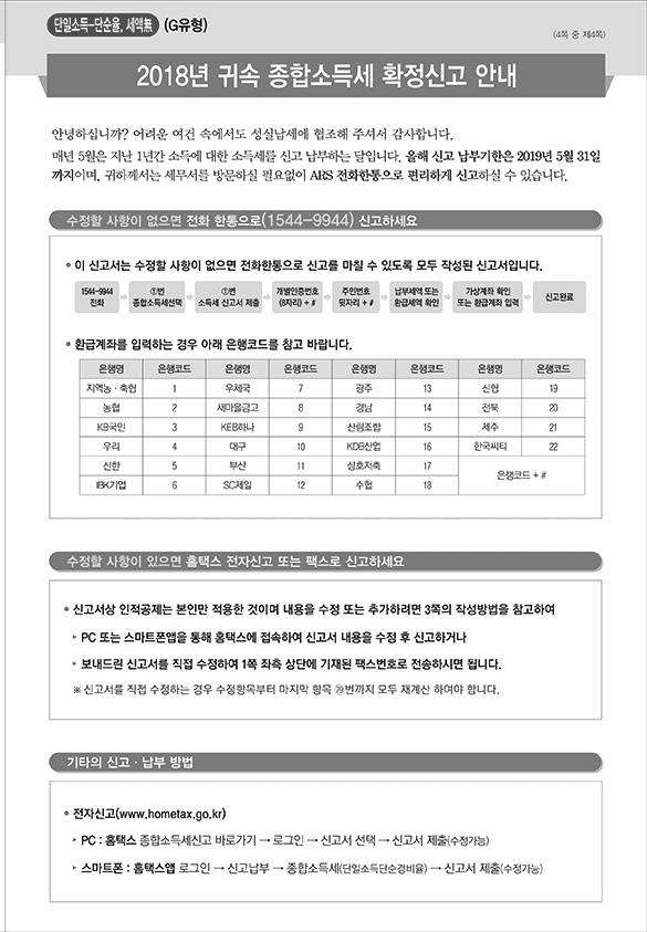 2018년 귀속 종합소득세 ARS 신고안내(F~H유형)