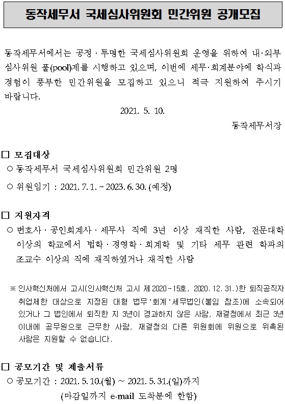 동작세무서에서는 공정ㆍ투명한 국세심사위원회 운영을 위하여 내‧외부 심사위원 풀(pool)제를 시행하고 있으며, 이번에 세무‧회계분야에 학식과 경험이 풍부한 민간위원을 모집하고 있으니 적극 지원하여 주시기 바랍니다.