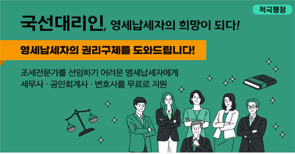 조세전문가를 선임하기 어려운 영세납세자에게 세무사,공인회계사,변호사를 무료로 지원합니다.