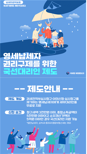 신청요건은 청구세액 3천만원이하, 종합소득금액이 5천만원이하이고 소유재산가액이 5억원 이하인 경우 국선대리인 지원가능합니다.