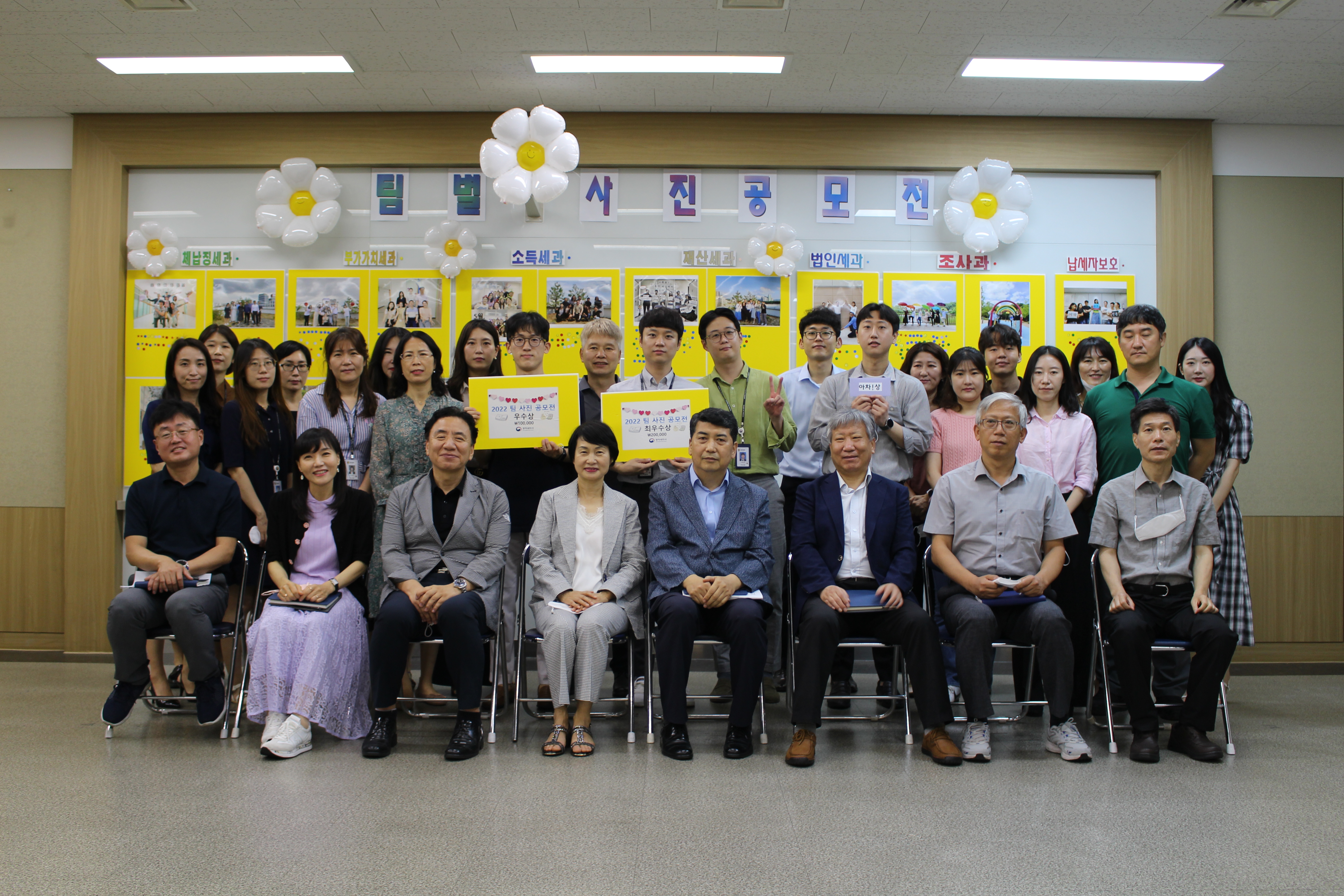 명예의 1위 수상은 재산세과 재산1팀이 업무의 고충이 느껴지는 유머러러스한 사진으로 많은 직원분들의 공감을 얻게 되어 수상하게 되었고, 2위는 조사과의 세원정보·조사관리팀으로 아름다운 보라매공원 호수를 배경으로 삼아, 형형색색 펼쳐진 우산을 들고 팀원간 화합이 느껴지는 사진으로 수상을 하게 되었습니다.