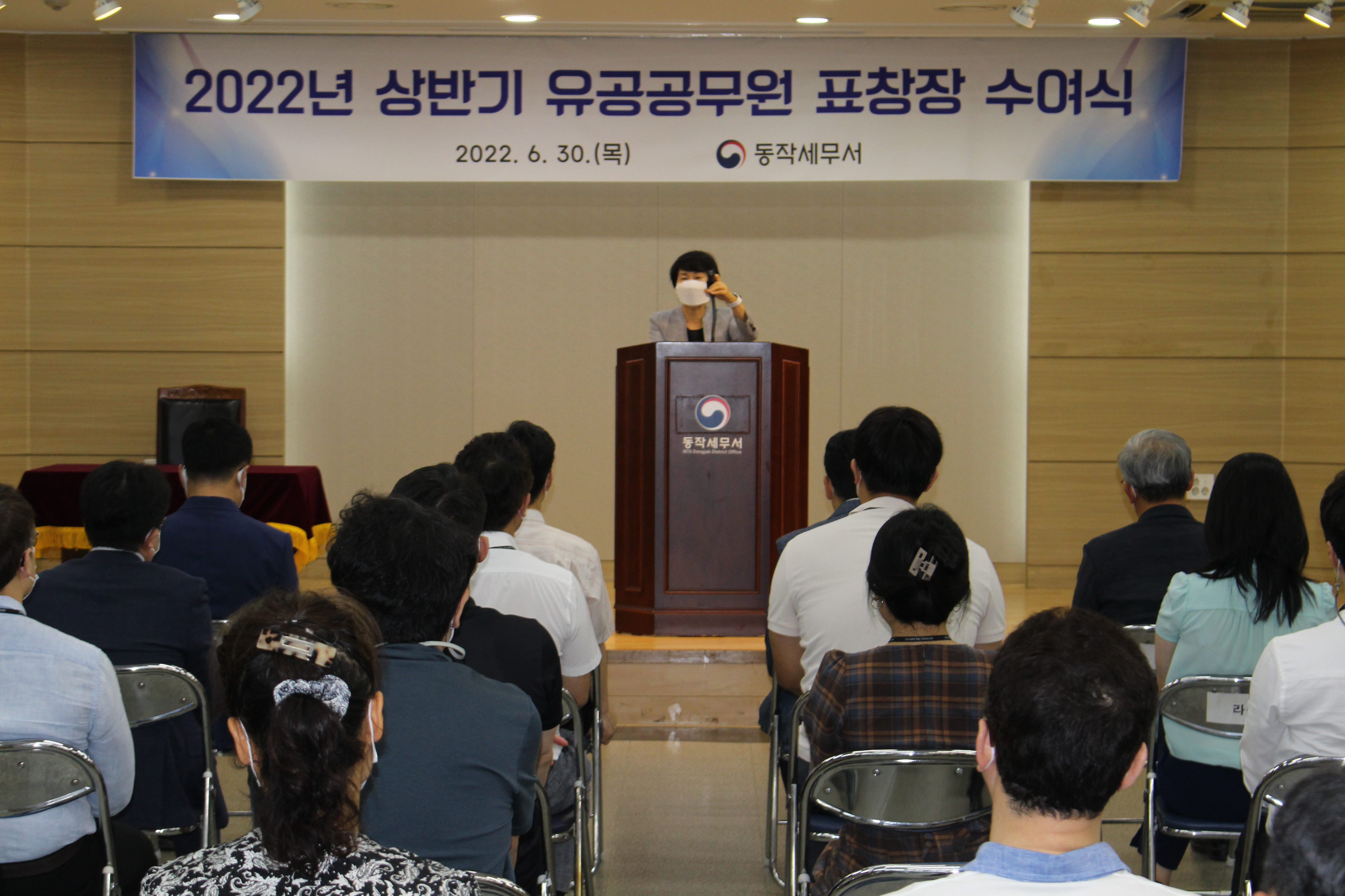 동작세무서(서장 표진숙)는 2022.6.30.(목) 2층 대강당에서 2022년 상반기 유공공무원 표창 수여식을 진행하였습니다.