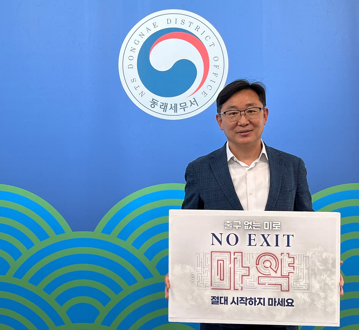 동래세무서 김호현 서장이 31일 마약으로부터 안전한 사회를 만들겠다는 의지를 담아 '출구 없는 미로'(NO EXIT) 마약 범죄 예방 릴레이 캠페인에 참여했다.
