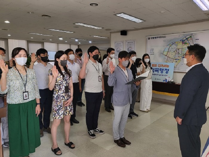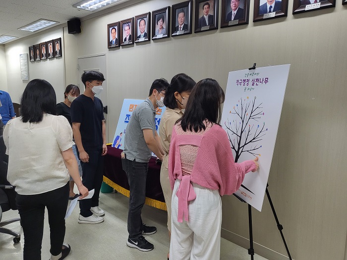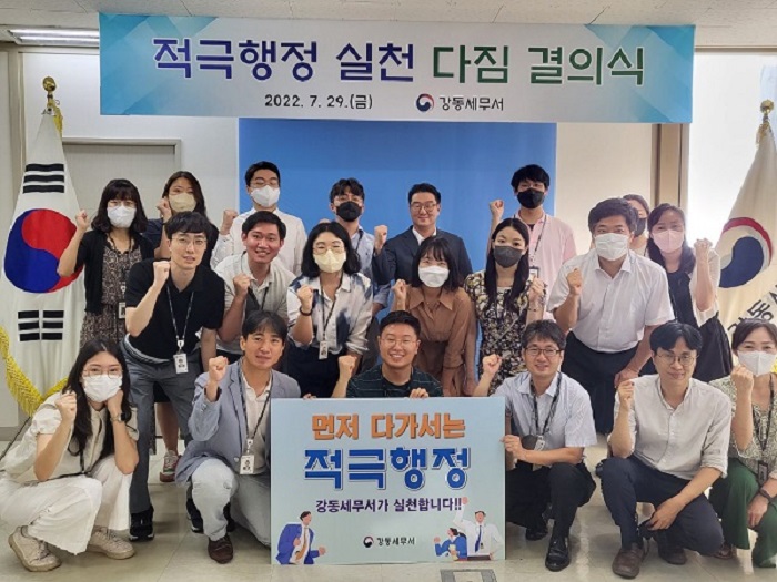 강동세무서(서장 유진재)는 22.07.29(금) 코로나 방역지침을 준수하는 가운데, 적극행정 다짐 결의식을 진행하였습니다.