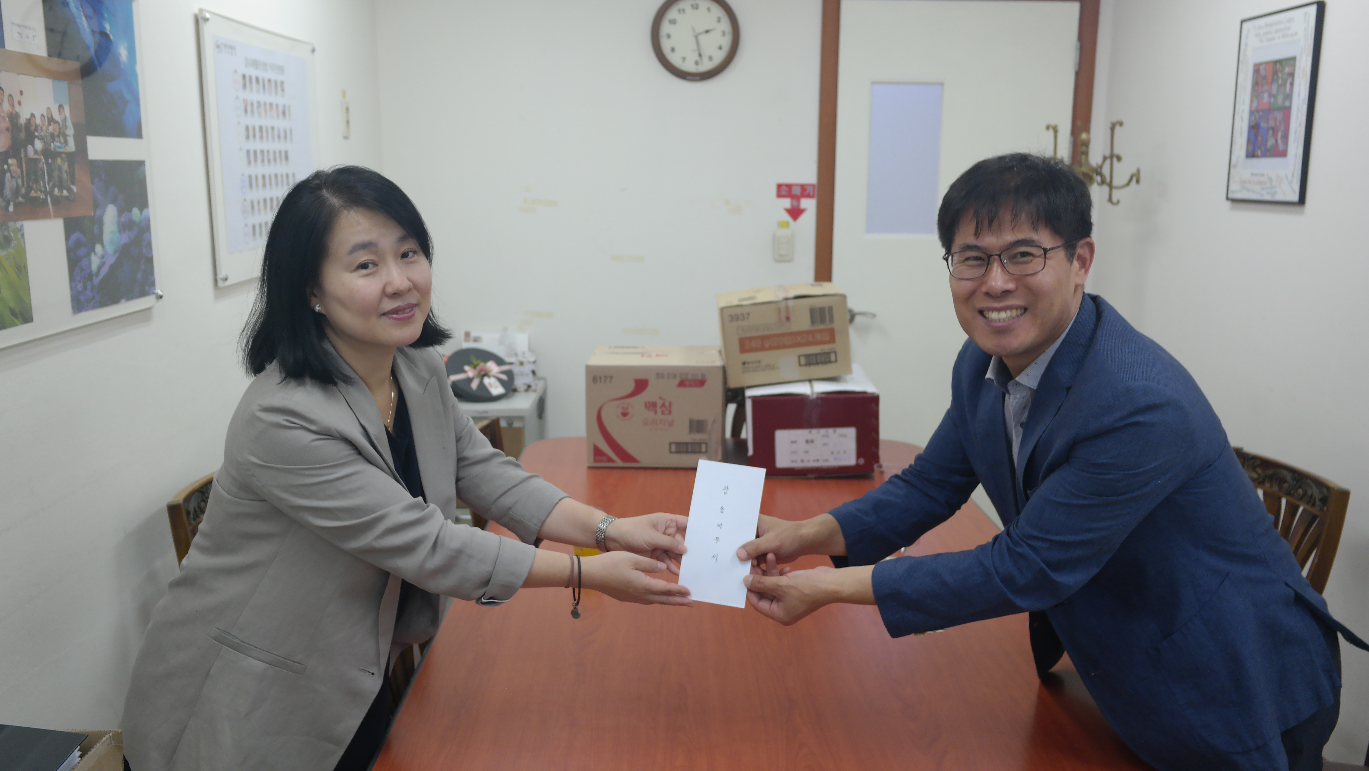 직원들이 방문하여 곧 다가올 추석을 맞이하여 기부금 전달 및 재활원 청소,
