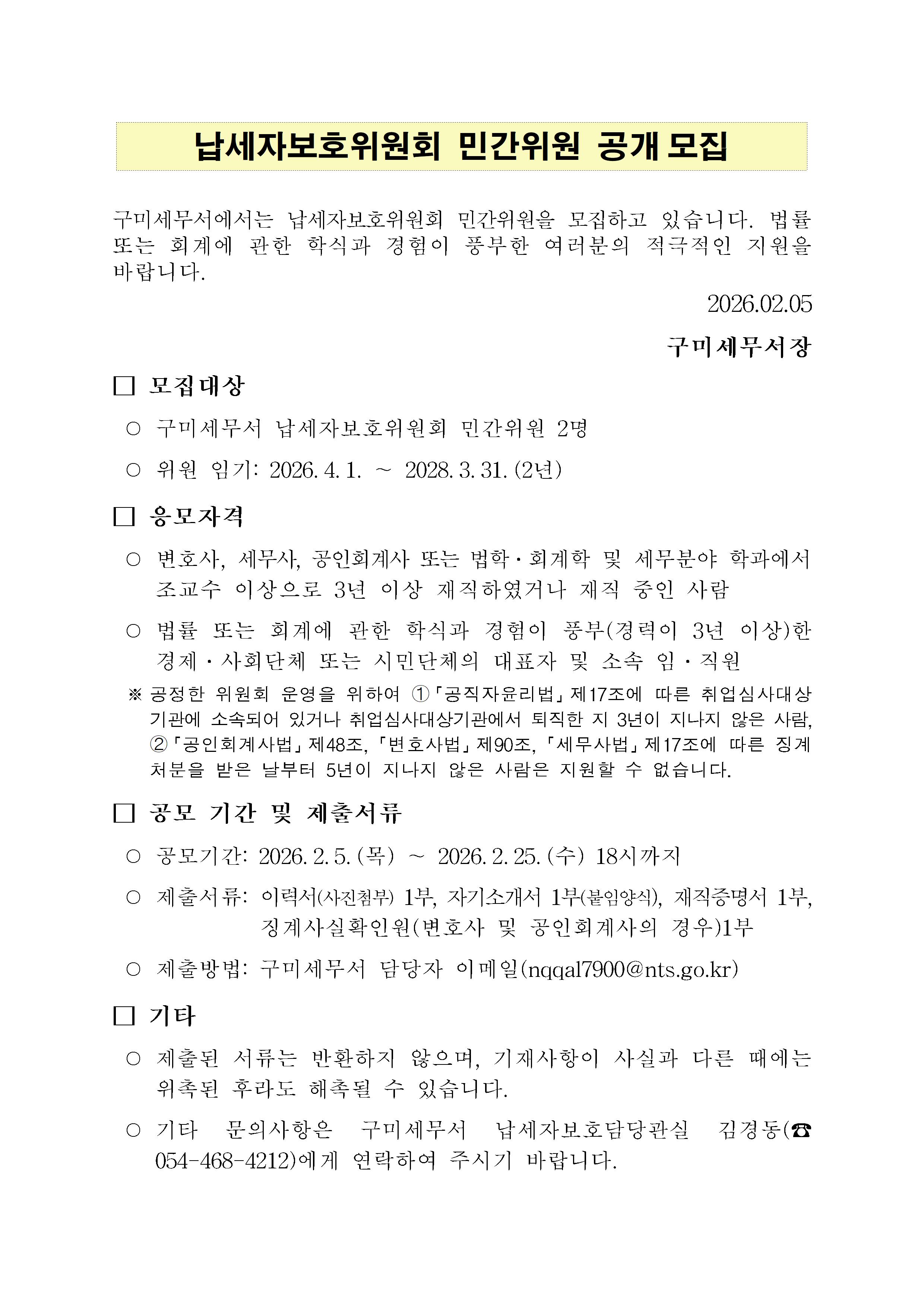 2026년 납세자보호위원회 민간위원 공개모집 공고