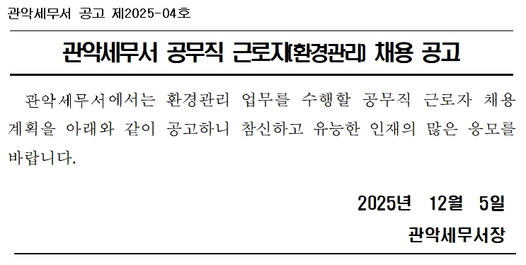 관악세무서 공무직 근로자(환경관리) 채용 공고