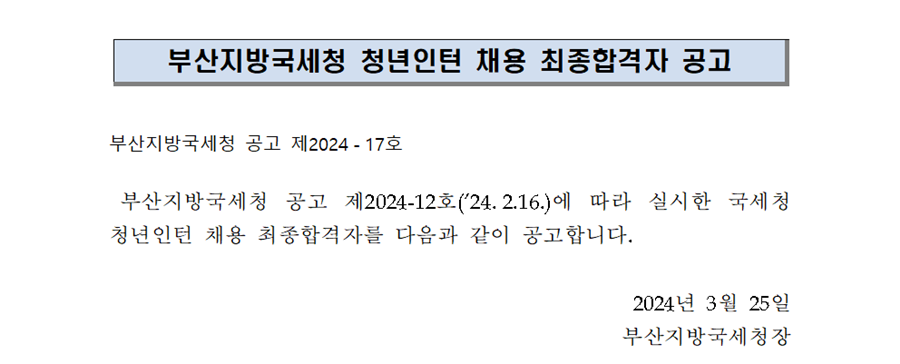 부산지방국세청 청년인턴 채용 최종 합격자 공고