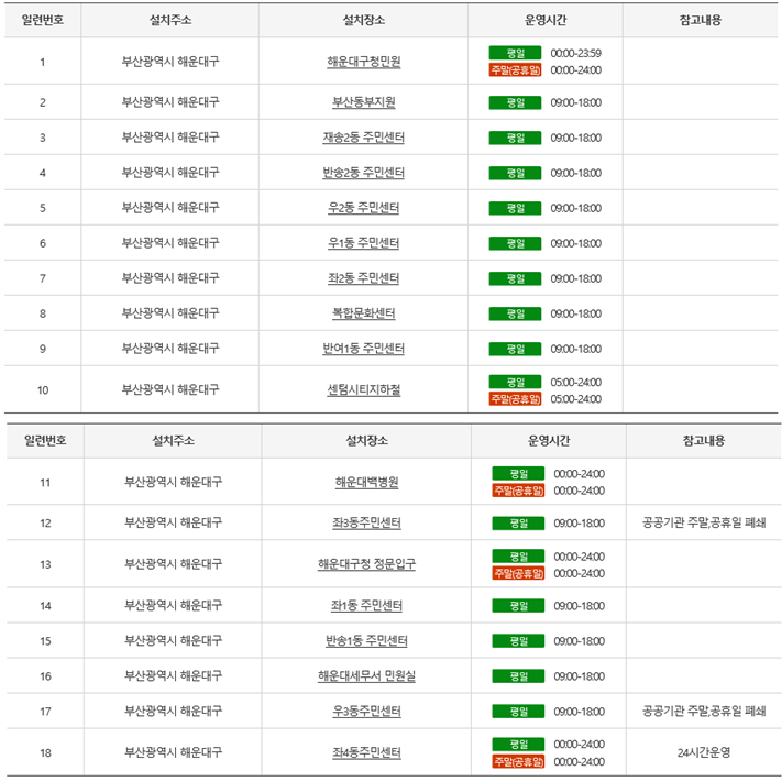 코로나19 확산 방지를 위해 세무서를 방문하지 않고도 발급이 가능한 각종 국세증명 등은 인터넷(정부24, 홈텍스)과 스마트폰(손텍스)를 이용하시고 해운대구 내에 무인민원발급기 현황을 알려 드리니 가급적 직접 방문을 자제해주시기 바랍니다. 해운대구 내 무인민원발급기 안내 (정부24) https://www.gov.kr/mw/AA090NoManMinwonView.do?sidoCd=6260000&siggCd=3330000&emdongCd=ALL&srchTxt=&pageIndex=1