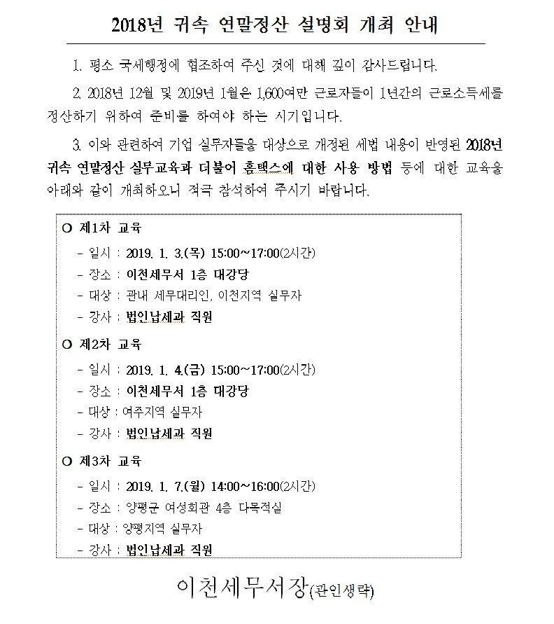 2018년 귀속 연말정산 설명회 개최 안내