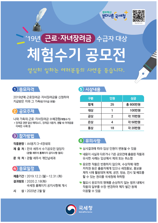 -이천세무서 근로 자녀 장려금 체험수기 공모전 담당 -성명: 전신희 -연락처: 031)644-0546 -이메일: tlc0105@nts.go.kr