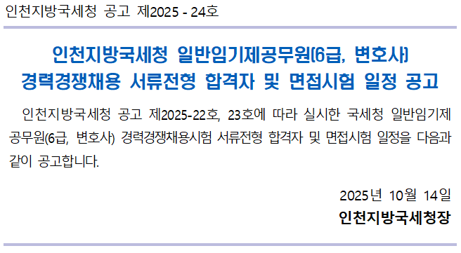 인천지방국세청 공고 제2025-24호 인천지방국세청 일반임기제공무원(6급, 변호사) 경력경쟁채용 서류전형 합격자 및 면접시험 일정 공고 인천지방국세청 공고 제2025-22호, 23호에 따라 실시한 국세청 일반임기제공무원(6급, 변호사) 경력경쟁채용시험 서류전형 합격자 및 면접시험 일정을 다음과 같이 공고합니다. 2025년 10월 14일 인천지방국세청장