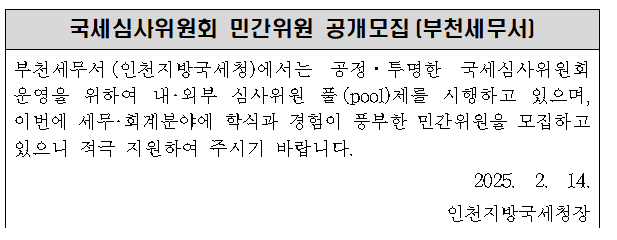 국세심사위원회 민간위원 공개모집(부천세무서) 부천세무서(인천지방국세청)에서는 공정ㆍ투명한 국세심사위원회 운영을 위하여 내‧외부 심사위원 풀(pool)제를 시행하고 있으며, 이번에 세무‧회계분야에 학식과 경험이 풍부한 민간위원을 모집하고 있으니 적극 지원하여 주시기 바랍니다. 2025. 2. 14. 인천지방국세청장