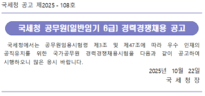 국세청 공고 제2025-108호 국세청 공무원(일반임기 6급) 경력경쟁채용 공고 국세청에서는 공무원임용시험령 제3조 및 제47조에 따라 우수 인재의 공직유치를 위한 국가공무원 경력경쟁채용시험을 다음과 같이 공고하여 시행하오니 많은 응시 바랍니다. 2025년 10월 22일 국 세 청 장