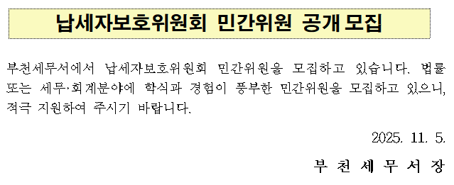 납세자보호위원회 민간위원 공개모집 부천세무서에서 납세자보호위원회 민간위원을 모집하고 있습니다. 법률 또는 세무·회계분야에 학식과 경험이 풍부한 민간위원을 모집하고 있으니, 적극 지원하여 주시기 바랍니다. 2025. 11. 5. 부 천 세 무 서 장