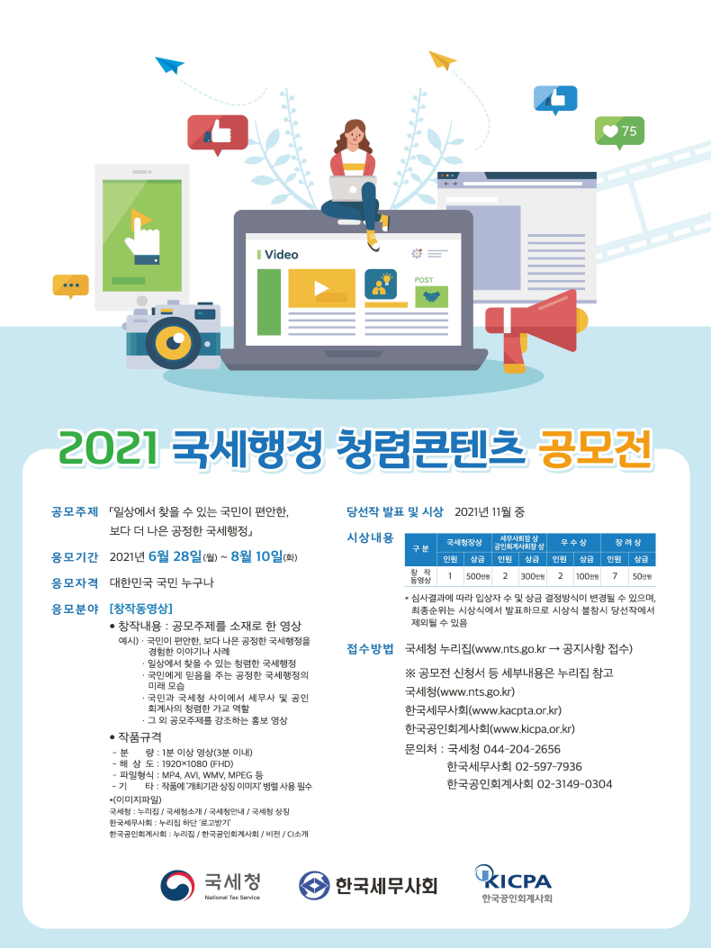 국세청・한국세무사회・한국공인회계사회가 공동으로 청렴문화 조성을 위해『청렴 콘텐츠』공모전을 개최하오니 많은 참여바랍니다. 일상에서 찾을 수 있는 국민이 편안한, 보다 더 나은 공정한 국세행정을 주제로 대한민국 국민이면 누구나 참여 가능하며 자세한 사항은 국세청 감사관실 044-204-2656, 한국세무사회 02-597-7936 한국공인회계사회 02-3149-0304로 문의주시기 바랍니다.