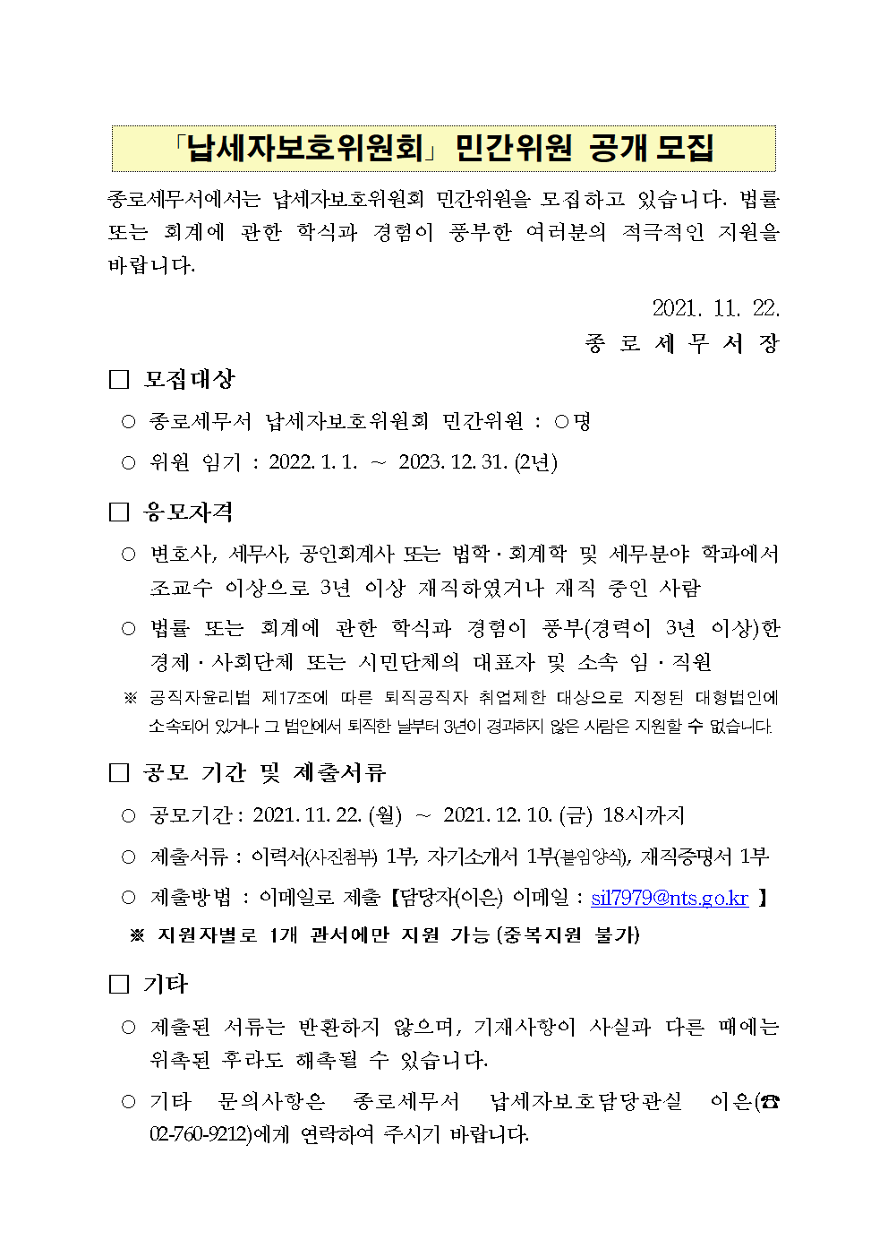 종로세무서에서는 납세자보호위원회 민간위원을 모집하고 있습니다. 법률 또는 회계에 관한 학식과 경험이 풍부한 여러분의 적극적인 지원을 바랍니다. 응시자격, 공모 기간 및 제출서류 등 자세한 사항은 종로세무서 납세자보호담당관실 이은조사관(02-760-9212)에게 연락하여 주시기 바랍니다.