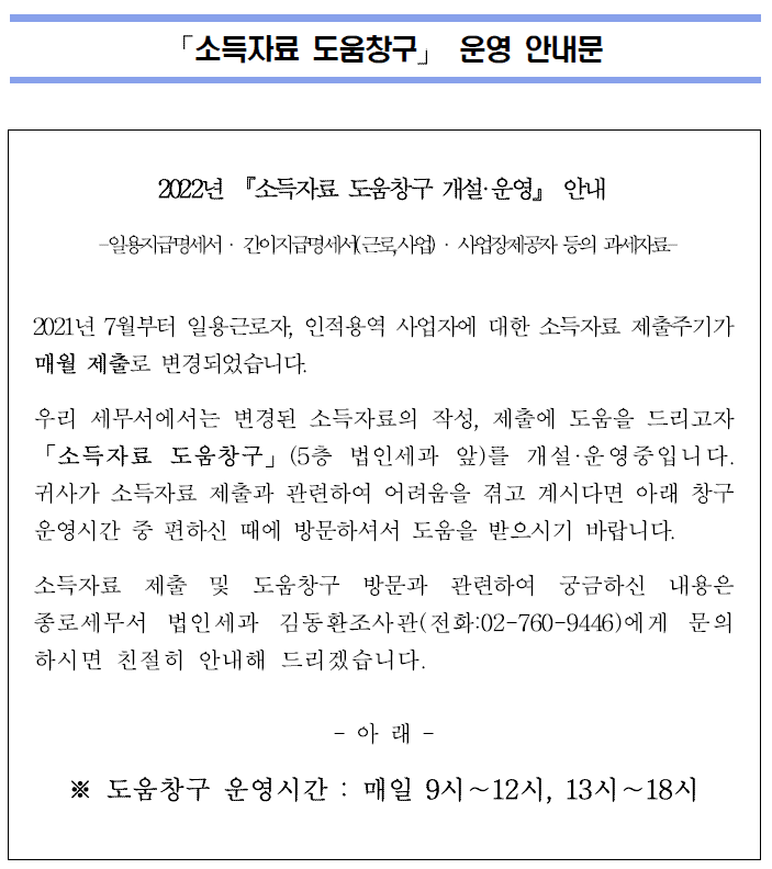 우리 세무서에서는 변경된 소득자료의 작성, 제출에 도움을 드리고자 「소득자료 도움창구」(5층 법인세과 앞)를 개설·운영중입니다.