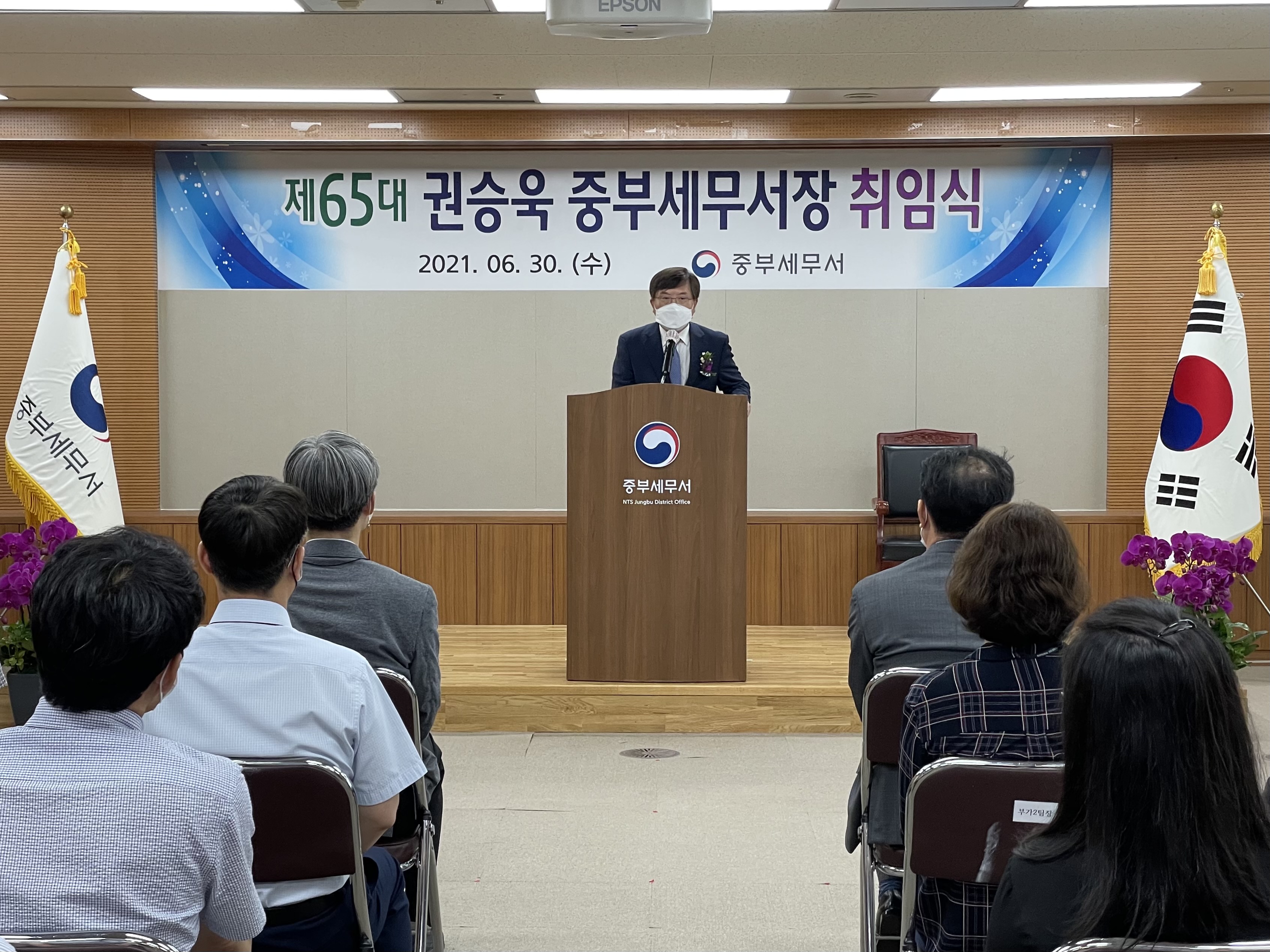 중부세무서는 지난 6월 30일에 청사 6층 대강당에서 제65대 권승욱 서장의 취임식을 개최하였습니다.