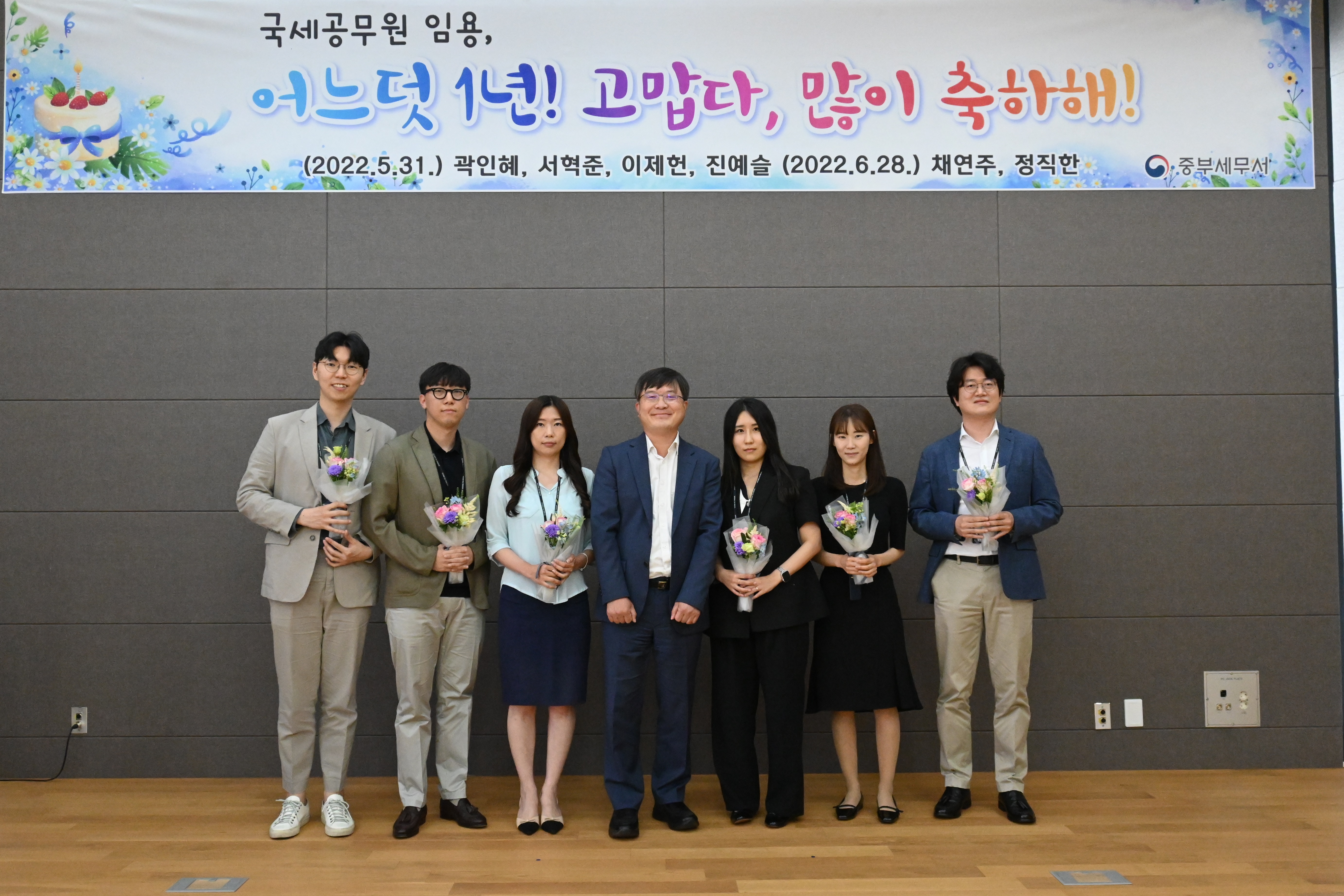 중부세무서(서장 권승욱)는 지난 5월 31일 (화) 새내기 직원들의 임용 1주년을 축하하는 자리를 마련했습니다.