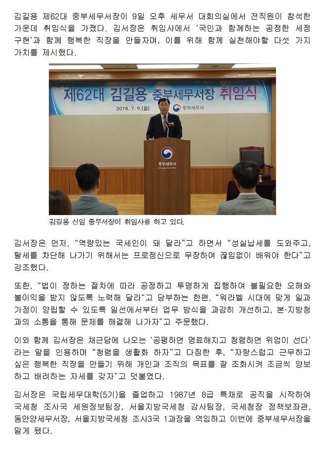 제62대 김길용 중부세무서장 취임