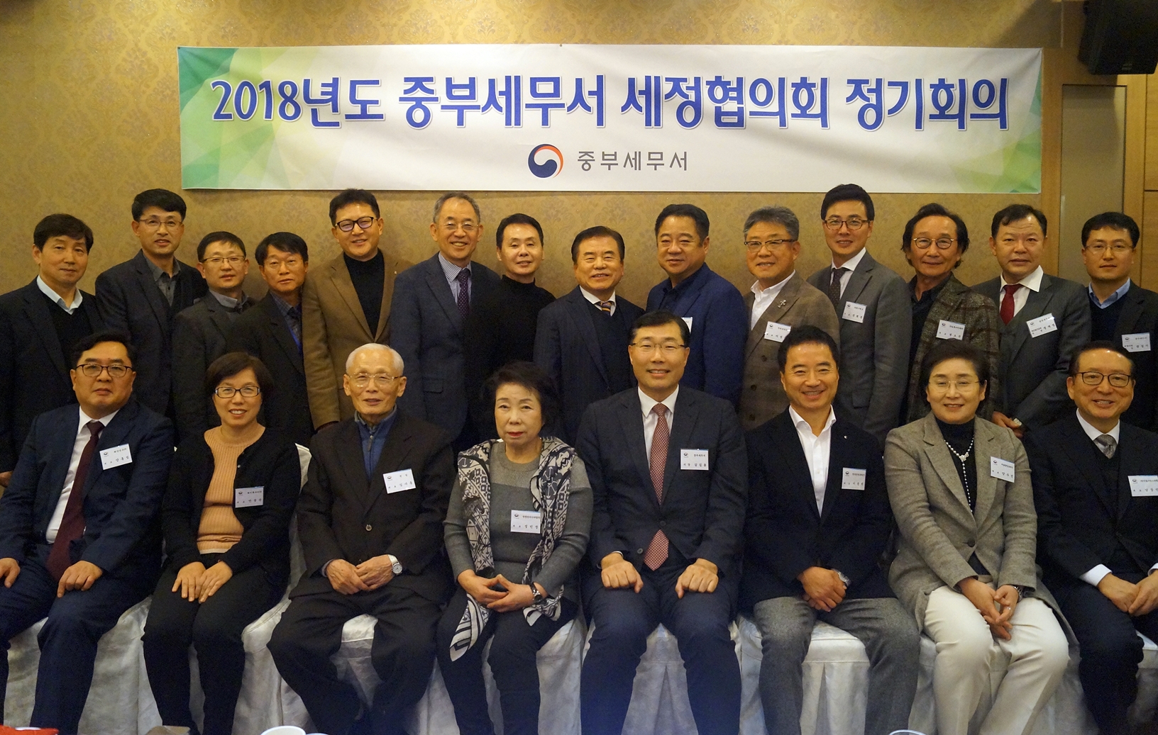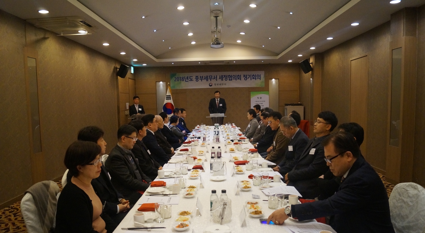 ○ 중부세무서장(김길용)은 2018. 12. 4. (화) 관내에서 세정협의회 정기회의를 개최하였습니다. 각 과장들의 주요 세정현안 보고에 이어 외부위원들의 경영여건, 건의사항 등 다양한 주제로 대화하며 한 해 동안의 활동을 정리하는 시간을 가졌습니다.
