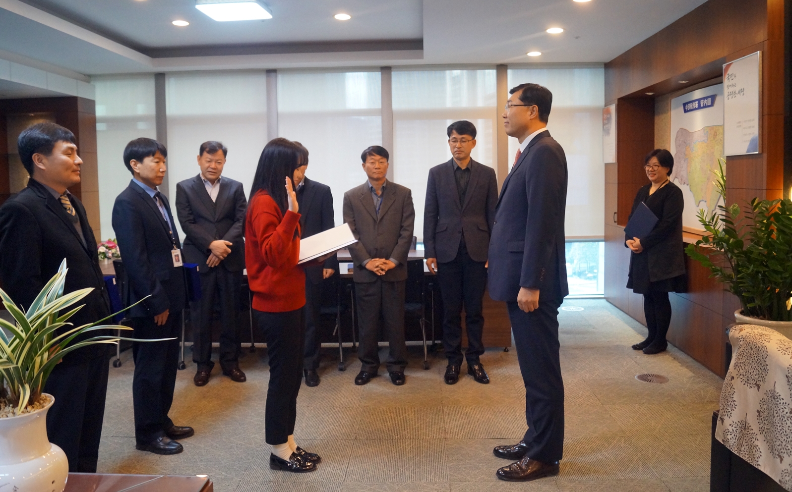 ○ 중부세무서장은 이어 신규직원(운영지원과 허정희)에게 인사발령 통지서를 수여하였습니다.