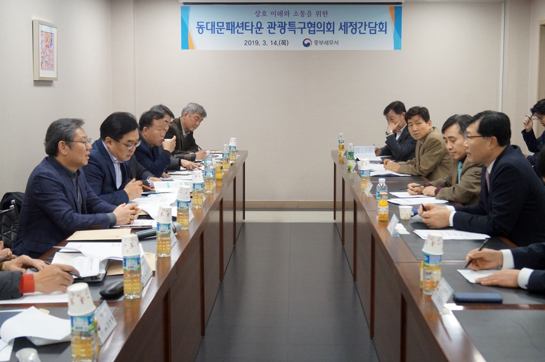 ○ 중부세무서장(김길용)은 2019. 3. 14. (목) 동대문 남평화상가 4층 회의실에서 동대문패션타운 관광특구협의회 상가대표들을 대상으로 간담회를 개최하여 현장의 목소리를 청취하고 건의사항에 대하여 격의없이 토론하였습니다.