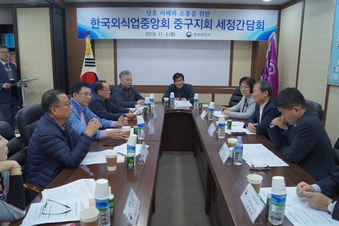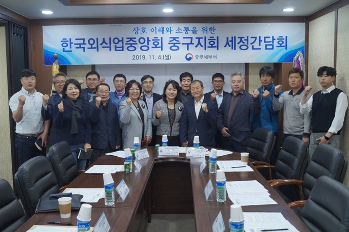 ○ 중부세무서장(박수금)은 2019. 11. 4.(월) 관내 한국외식업중앙회 중구지회를 방문하여 김형순 중구지회장 및 임직원들과의 공감소통을 통해 현장의 목소리를 청취하고 세정애로 및 건의사항에 대하여는 적극적으로 지원하기로 하였습니다.