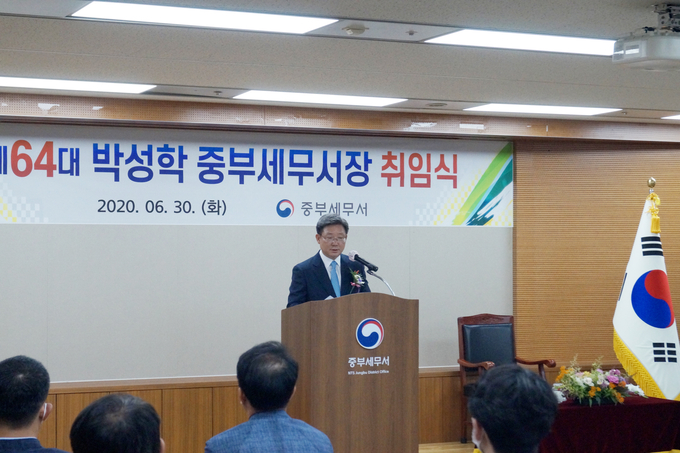○ 박성학 제64대 중부세무서장이 지난달 30일(화) 6층 대강당에서 전직원이 참석한 가운데 취임식을 가졌습니다. 박성학 중부세무서장은 취임사에서 코로나19로 인해 경제적 손실이 많은 관내 집단상가와 의류 도ㆍ소매업 및 임가공업, 여행업 등 수 많은 소상공인들에 대한 세정지원을 강화해 줄 것을 당부하였습니다.