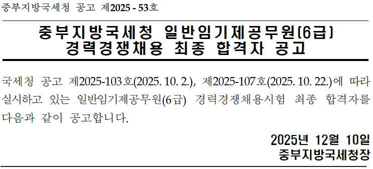 중부지방국세청 공고 제2025-53호 중부지방국세청 일반임기제공무원(6급) 경력경쟁채용 최종 합격자 공고 국세청 공고 제2025-103호(2025.10.2.), 제2025-107호(2025.10.22.)에 따라 실시하고 있는 일반임기제공무원(6급) 경력경쟁채용시험 최종 합격자를 다음과 같이 공고합니다. 2025년 12월 10일 중부지방국세청장